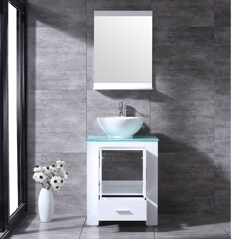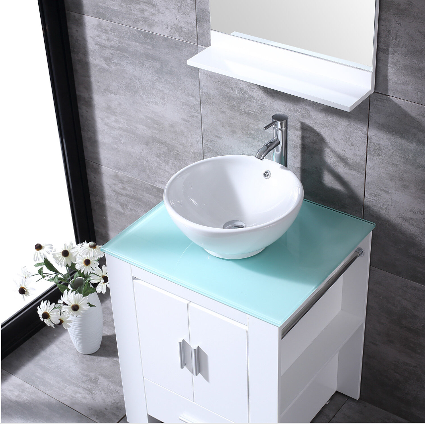 24" Modern Bathroom Vanity Plywood Cabinet Ceramic Vessel Sink Faucet Drain Set