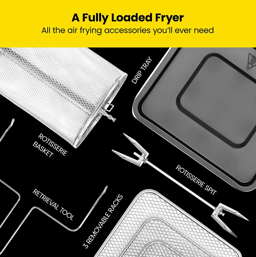 • All-inclusive: Includes three air flow racks, stainless steel rotisserie oven spit and forks, stainless steel rotating basket/retrieval tool, and a drip tray.