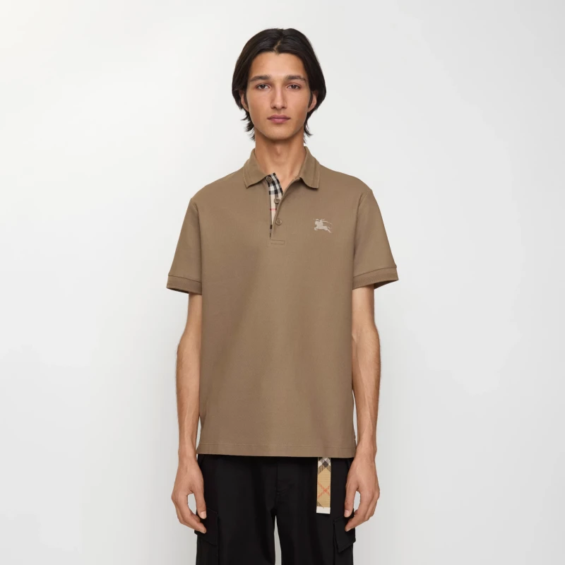 This polo shirt is crafted from a lightweight cotton pique mesh fabric, adorned with tonal Equestrian Knight's Logo (EKD) embroidery. It features a Burberry check lining at the placket, presented in a signature classic beige, creating a slim fit.