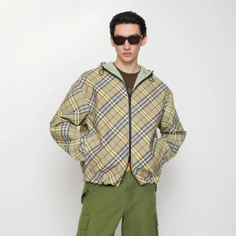 Lightweight coat made of twill fabric. With a drawstring hood, it presents a loose version. Double-faced and double-worn style, one side is decorated with Burberry plaid, and the other side is pure green nylon fabric decorated with the same color equestrian knight logo (EKD) decal.