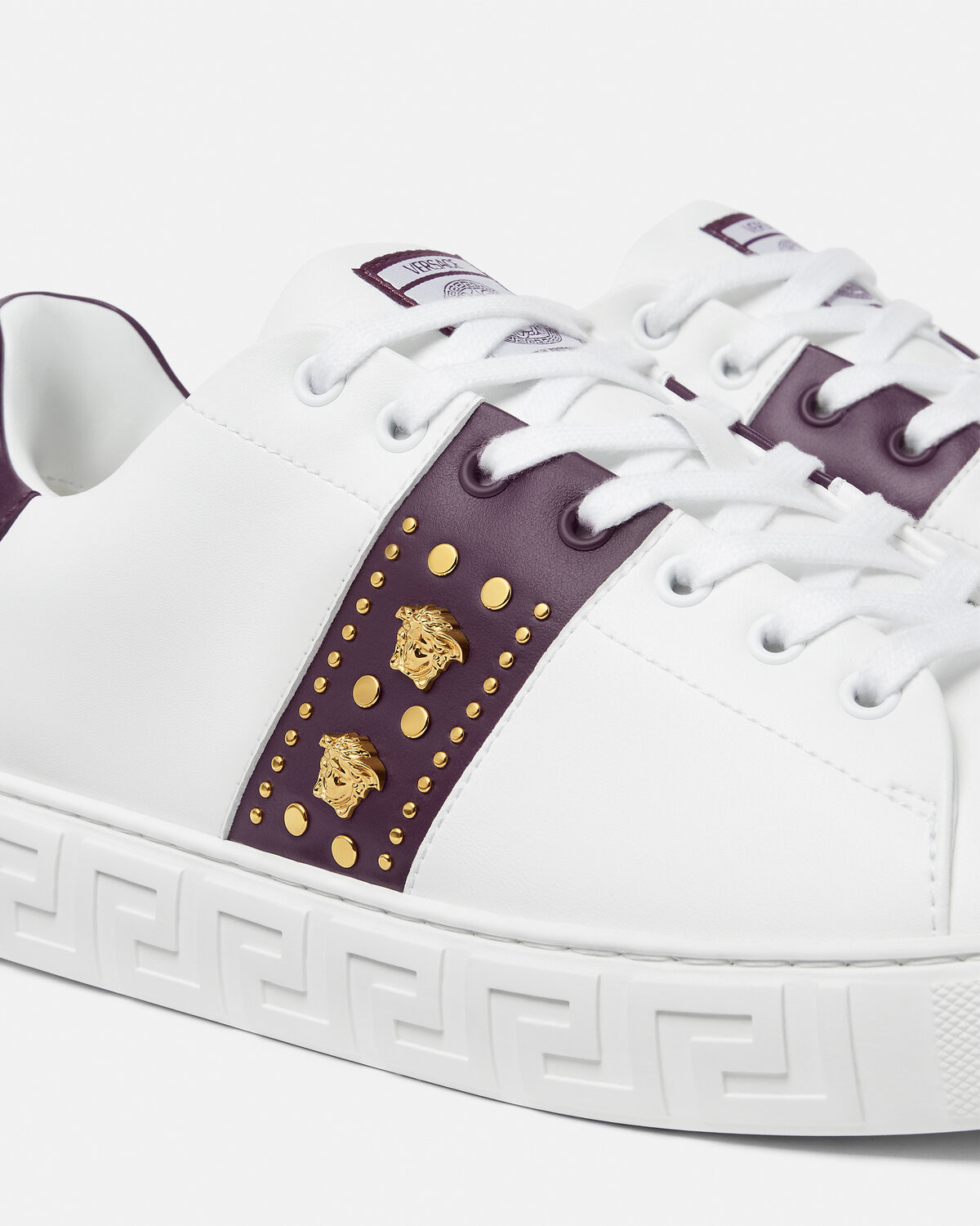 This low-cut sneaker features a Greca pattern carved on the sole, and the upper is decorated with rivets and embellished with Medusa accessories. The back side is decorated with Versace Logo stamp. Greca sports shoes are made of environmentally-friendly materials certified by recycled ingredients or/and derived from renewable raw materials.