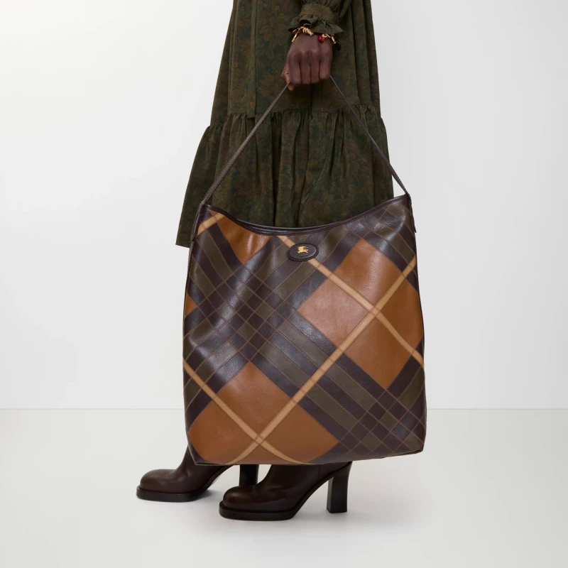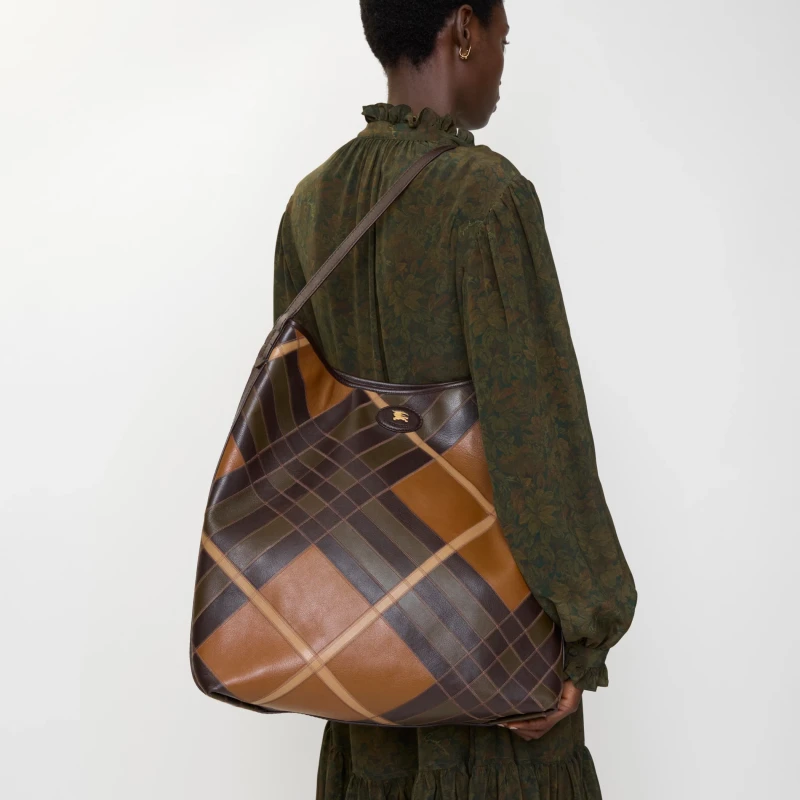 This shoulder bag draws inspiration from outdoor design. Crafted from grained buffalo leather, it is handcrafted in Italian workshops. It features a cotton lining. Leather panels are meticulously cut and hand-stitched, pieced together in Burberry check inlay. The size is suitable for a laptop and includes a slim shoulder strap. Adorned with a knight's stamp, a classic motif from the brand's 1980s bags, this piece debuted at the brand's 2025 Winter fashion show.