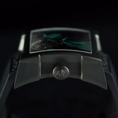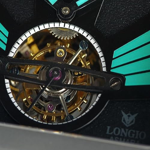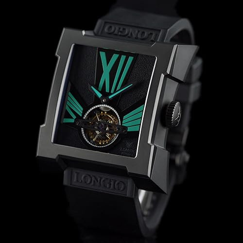 LONGIO Aamara Tourbillon Watch, Titanium DLC Case, Black Dial with Green Turquoise Roman Numerals, Mechanical Central Tourbillon Movement with Natural Rubber Strap