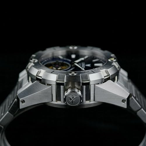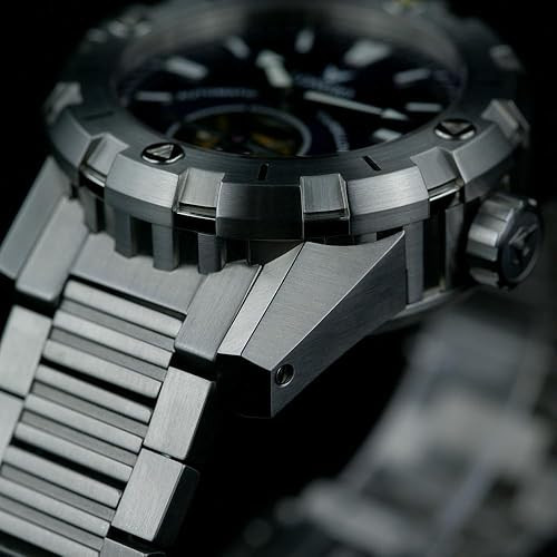 • 47mm stainless steel construction: A robust case structure with sharp angular geometry and a finely brushed surface, creating a bold industrial aesthetic.