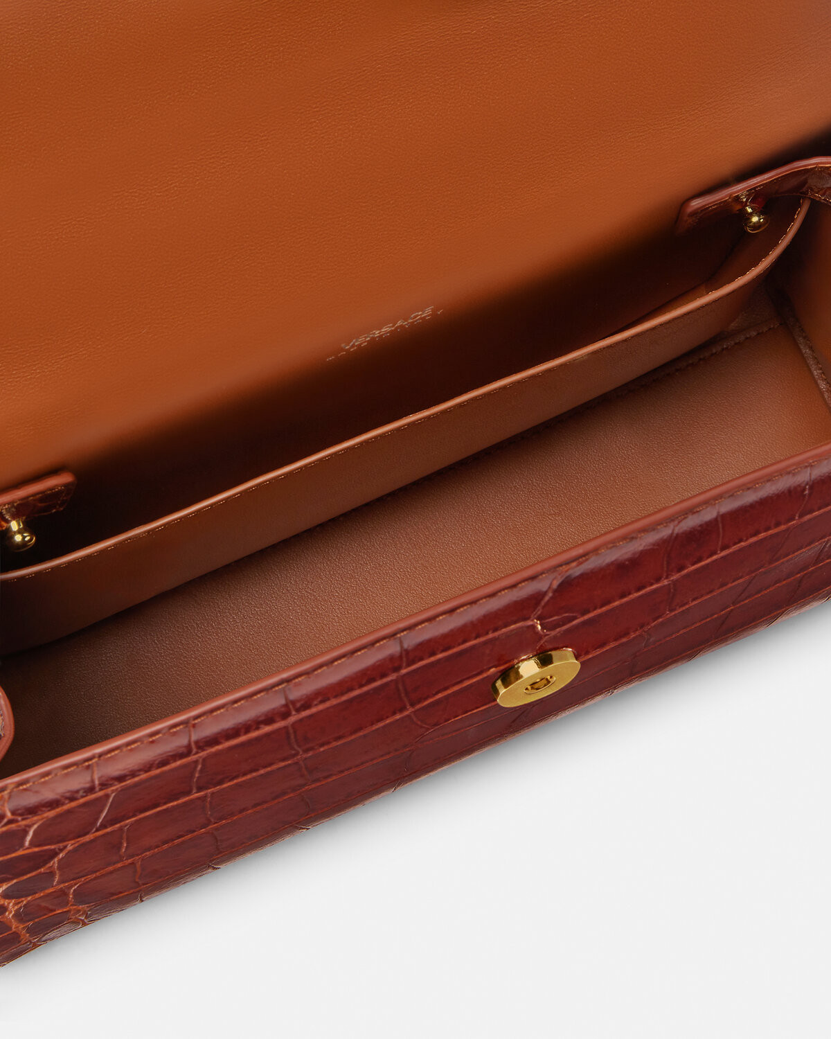 Medium handbag, embellished with lace details and the brand's iconic Medusa '95 accessories that first appeared in the 1995 series. Equipped with crocodile-like embossed leather top handle, magnetic buckle flip closure and detachable shoulder strap.