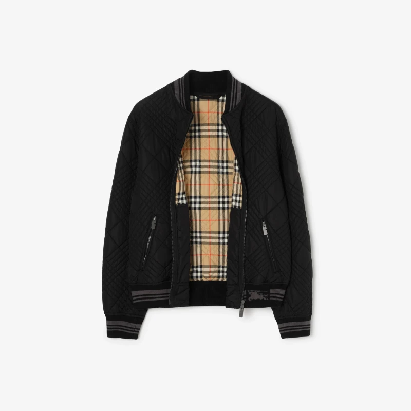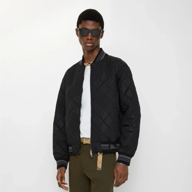 This flight jacket is crafted from a lightweight, shimmering nylon blend. Inspired by the brand's archival archives, the fabric incorporates contrasting fine-spun yarns to create an iridescent effect. The Rakewood style is accented with mini check stitching, a quilted detail that reinterprets the brand's iconic element. A striped hem with a knitted Equestrian Knight Logo (EKD) presents a regular fit.