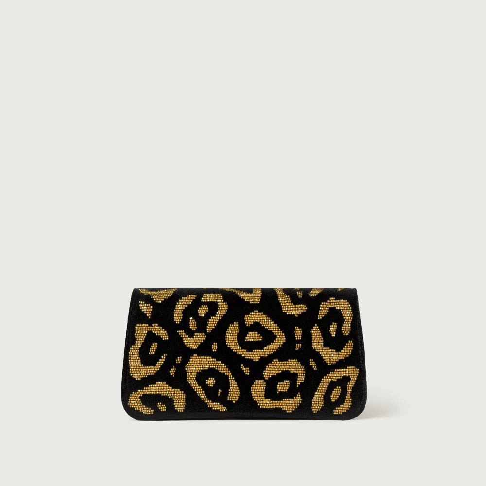 Panthère C de Cartier mini chain handbag, black tufted, embroidered gold beads, cheetah pattern, black enamel and gold-plated bread buttons, and gold "Cartier" logo on the inside. 1 inner compartment, 1 flat pocket and 1 logo pocket. The back of the handbag is provided with an outer flat bag. Lining: black lambskin. Detachable chain. Size: height: 100mm. Length: 200mm. Depth: 45 mm. Can be carried by hand or slung sideways.