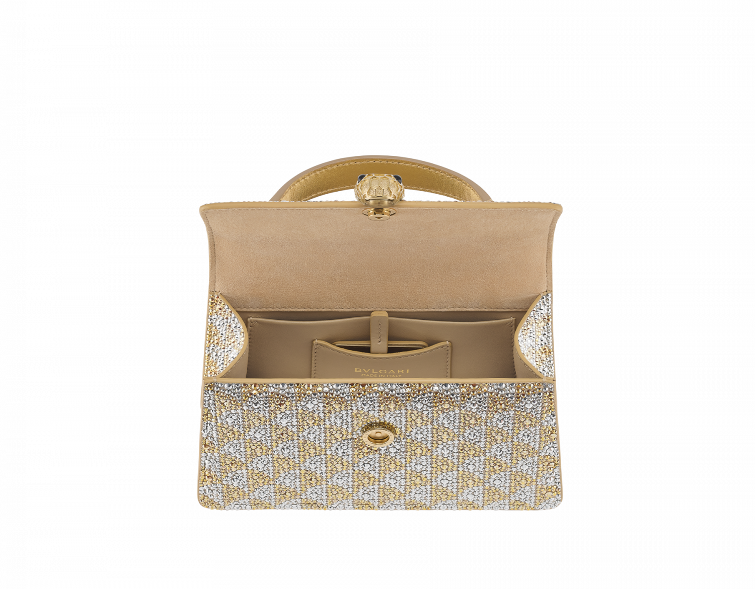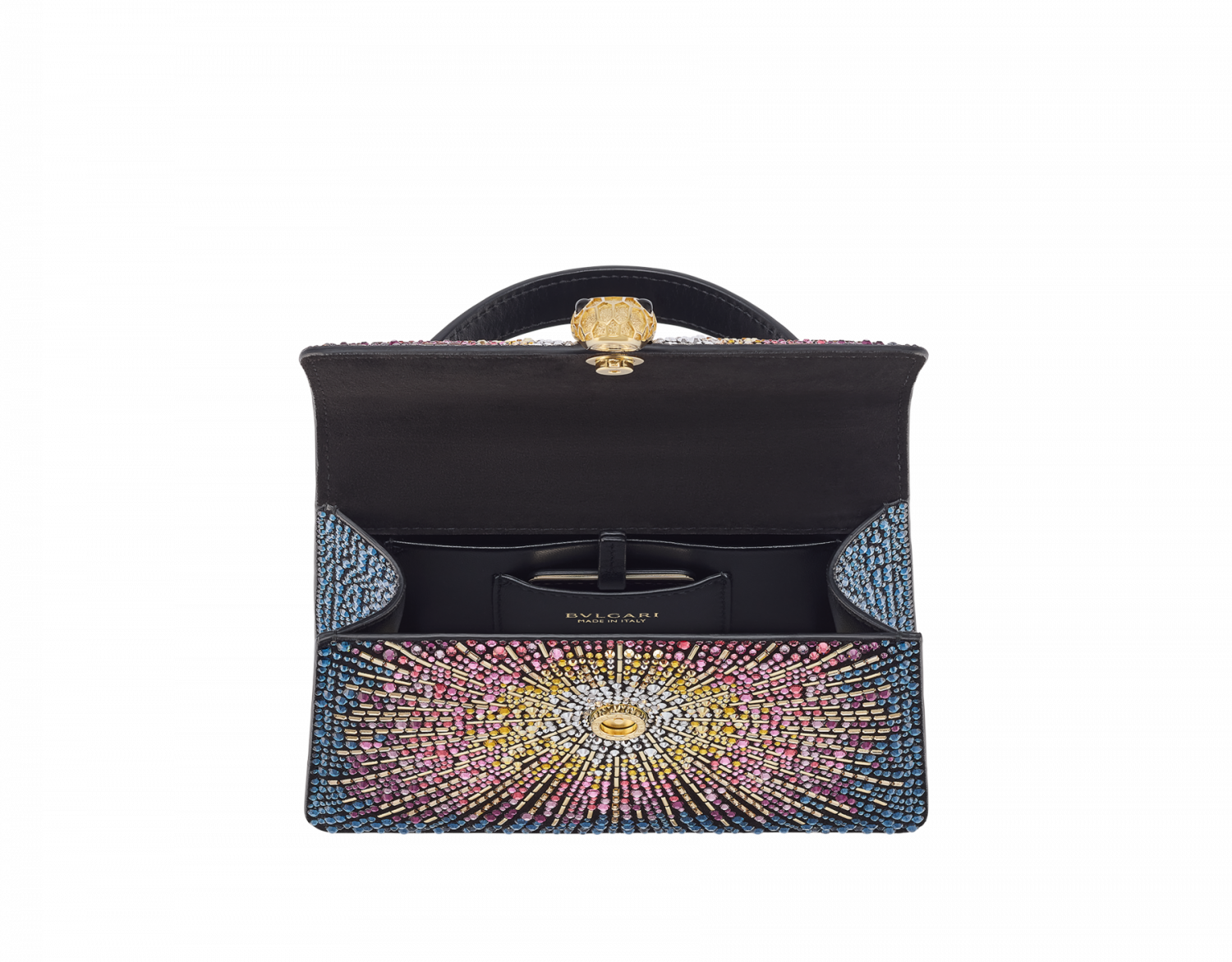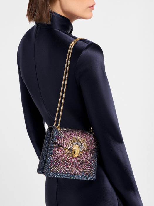 Serpenti Forever series mini handbags, made of black suede, are hand-inlaid with multi-color gradient crystals, which creatively interpret the bright and charming fireworks patterns, and are both modern and practical, easy to wear, showing off the fashion style. The work is matched with a snake-shaped chain and leather shoulder strap, decorated with the iconic snake head magnetic buckle. Its charming scales and unique design are inspired by the Serpenti series jewelry works in the 1960s, showing the effect of diamond cutting, and the texture of metal particles is as bright as snowflakes inlaid with diamonds. It has a single compartment, an internal open pocket and a mirror bag with a customized cosmetic mirror. 19 x 11 x 5.5-7.5 x 4.3 x 2.2 inches. Made in Italy.